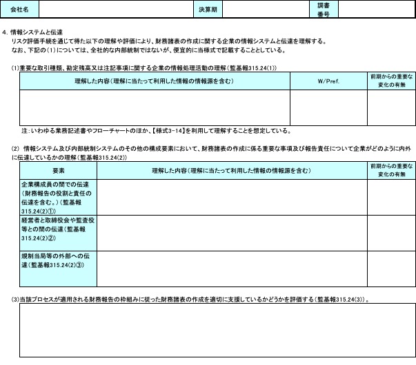 日本公認会計士協会(JICPA)が公表している「監査ツール」の【様式3-9】(情報システムと伝達)に理解した内容と評価を記録します。