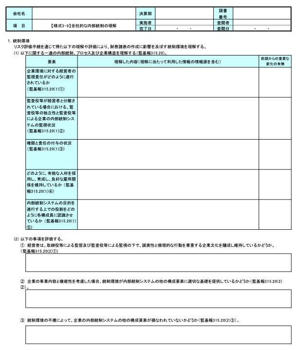 日本公認会計士協会(JICPA)が公表している「監査ツール」の【様式3-9】(統制環境)に理解した内容と評価を記録します。