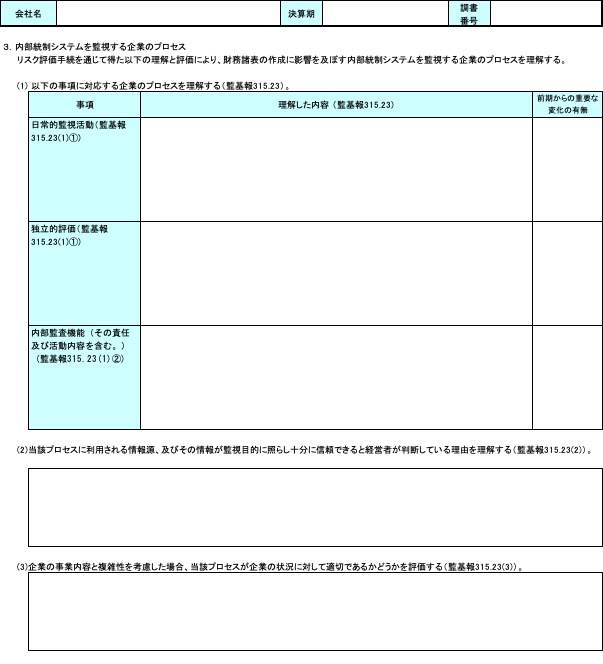 日本公認会計士協会(JICPA)が公表している「監査ツール」の【様式3-9】(監視活動)に理解した内容と評価を記録します。