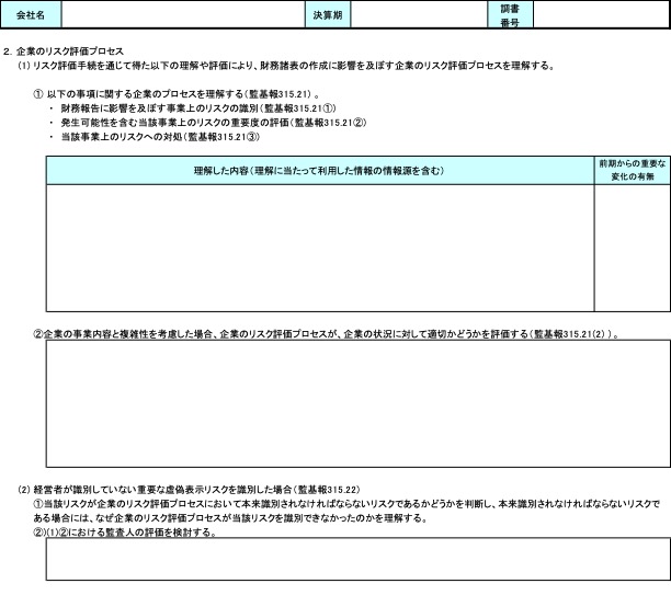 日本公認会計士協会(JICPA)が公表している「監査ツール」の【様式3-9】(リスク評価プロセス)に理解した内容と評価を記録します。